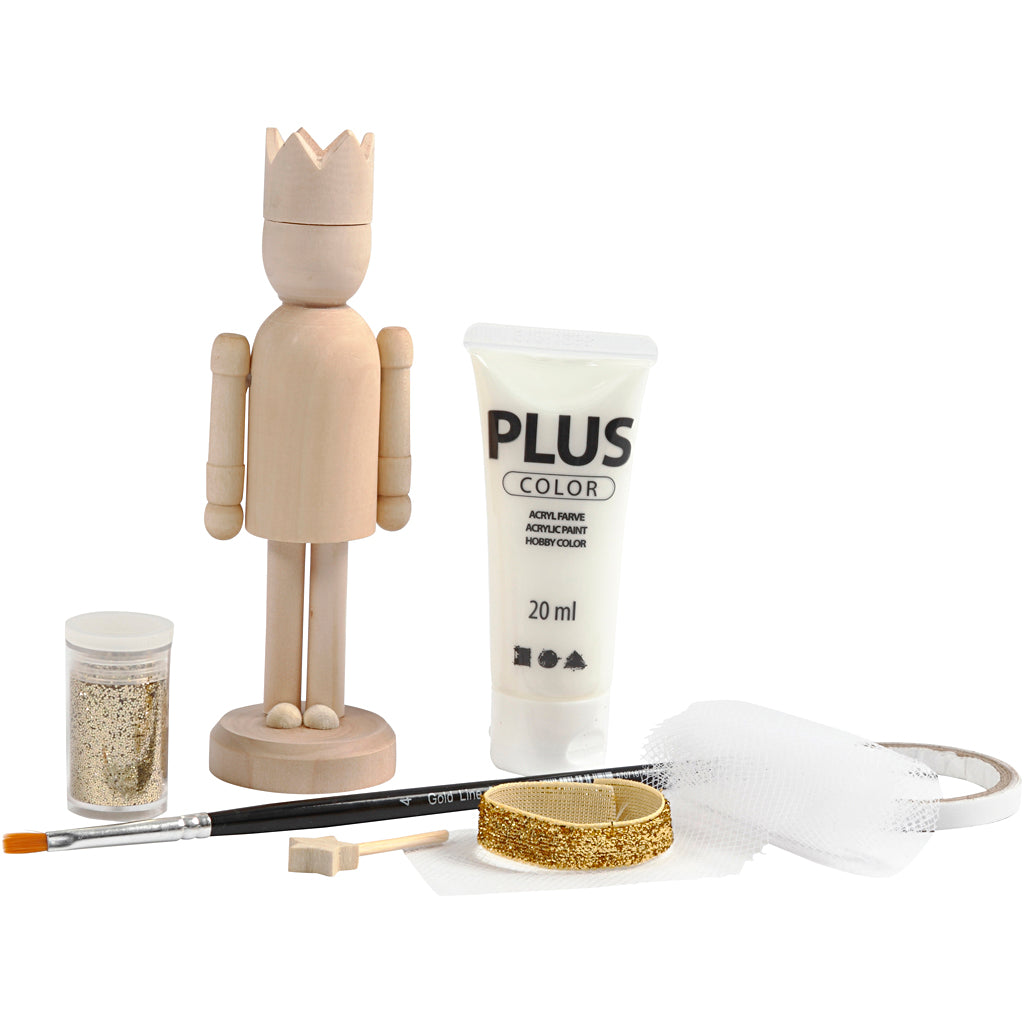 Materialenset voor 1 ballerina bestaande uit een figuur van hout, tule, glitter, verf, penseel, dubbelzijdig klevend tape en glitter Inhoud: 1 figuur en houten stok, 20ml off white hobbyverf, kwast, 5g goud glitter, 1x10cm goudkleurig glitterlint, 5x70cm fijn beschilderd wit tule, dubbelzijdig klevend tape