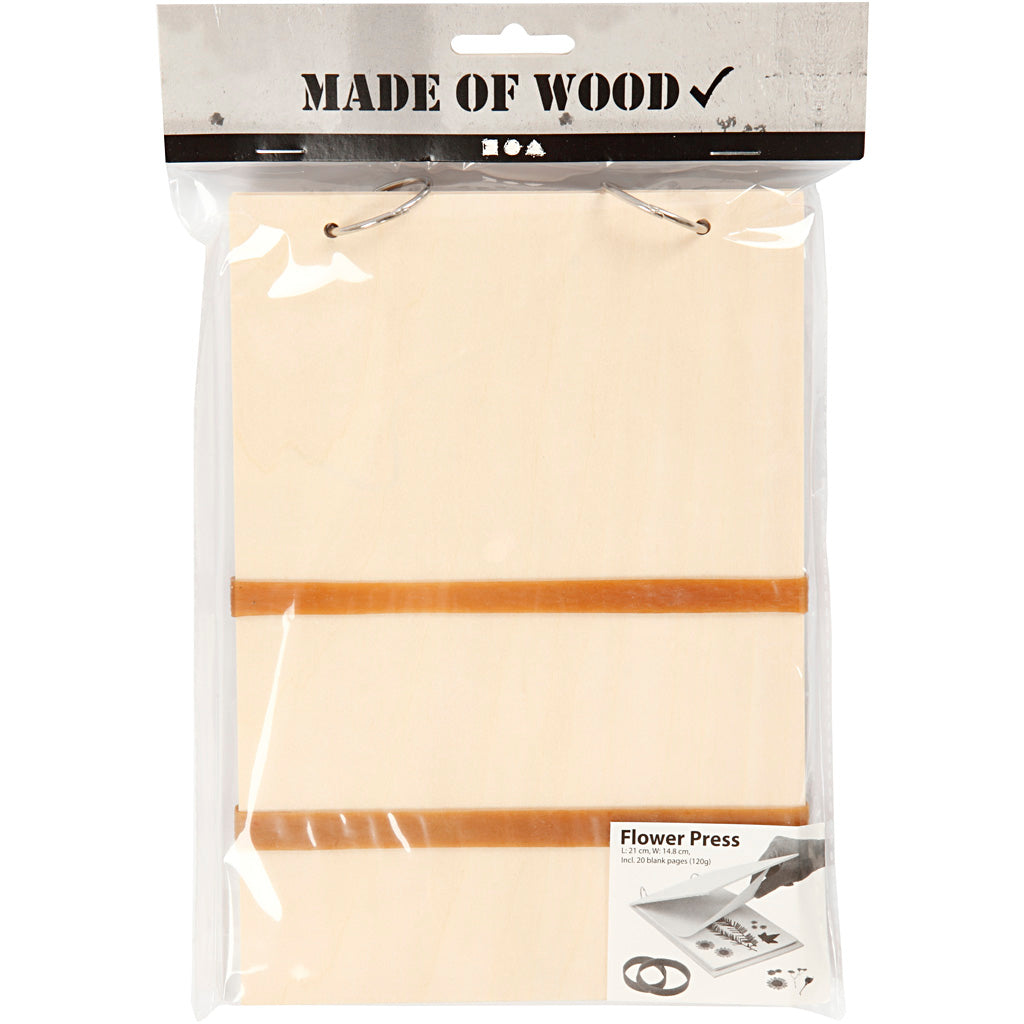Bloemenpers met licht houten kaft met hersluitbare metalen ringen en 20 blanco pagina's (120 gr). Twee brede elastische banden zijn inbegrepen, die rond de hoes zijn geplaatst voor extra druk.