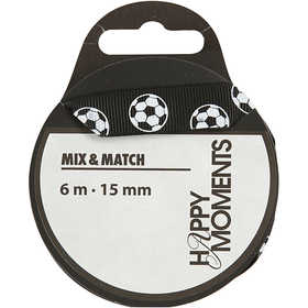 Zwart grosgrain lint bedrukt met witte voetballen Zwart grosgrain lint bedrukt met witte voetballen.