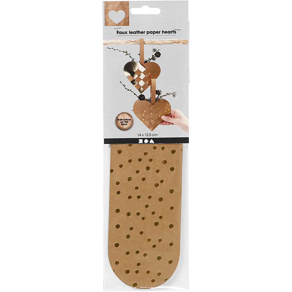 Materialenset met uitgestanste delen voor 4 gevlochten harten in 3 designs, Inclusief natuurlijke hengsels. Inhoud: sjabloon voor 2 harten van natuur, 1 hart in goud en 1 hart van natuur met goudfolie en 4 hengsels Inclusief instructie