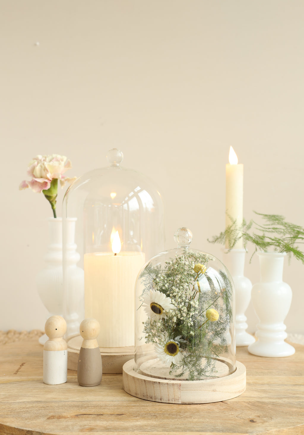 Vul de glazen stolpen met bijvoorbeeld droogbloemen, een leuke foto of met je eigen product! Wil je de stolpen op een tafel of kast zetten? Dan is het een leuk idee om gebruik te maken van verschillende soorten glazen stolpen.