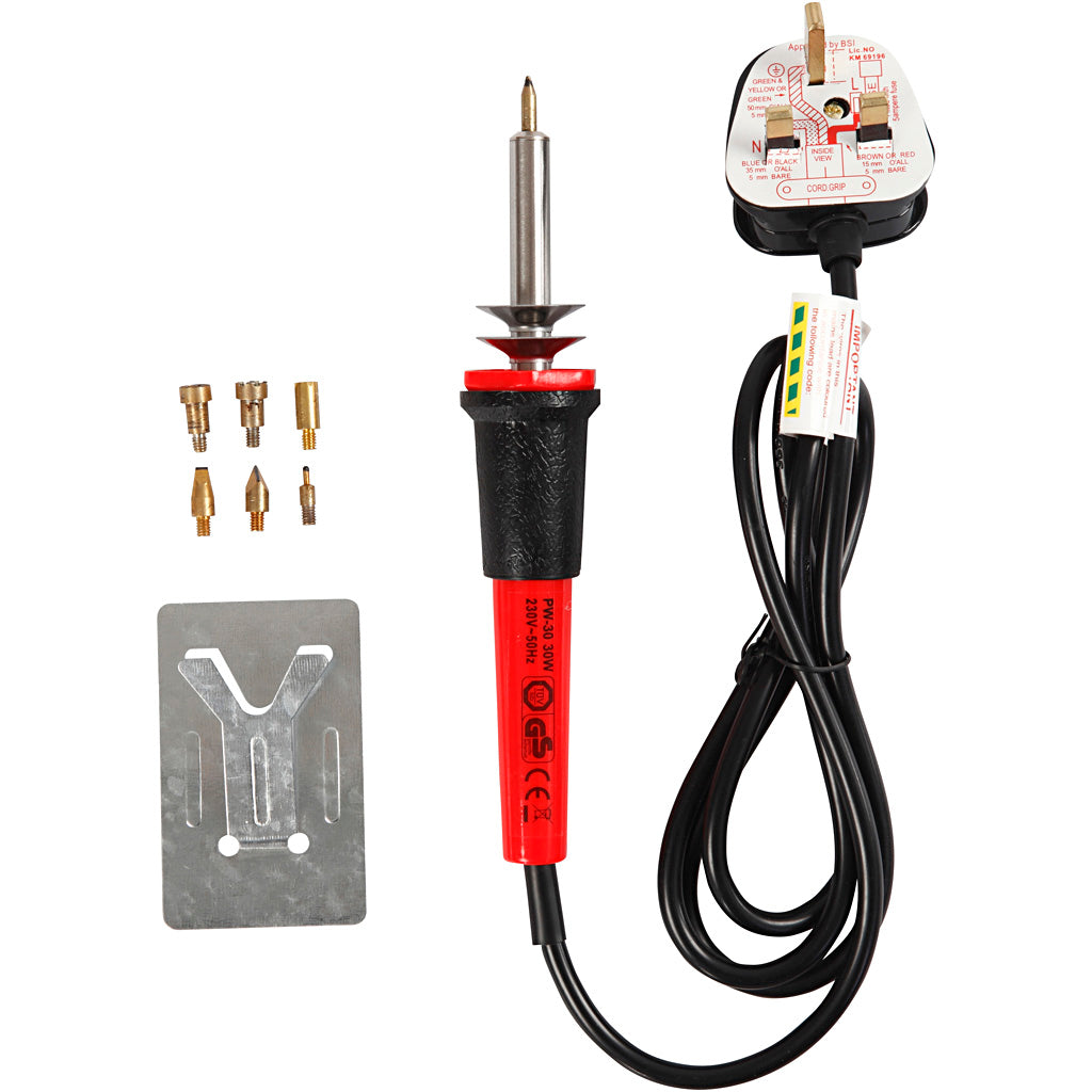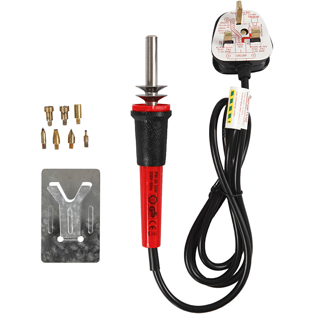 Elektrisch gereedschap met verwisselbare naalden voor het branden in kurk, leer en hout. Inclusief naalden voor maken van motieven en het tekenen uit de hand.