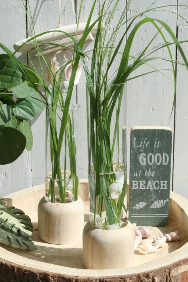 Deze hoogwaardige houten sokkels houden een heldere glazen reageerbuis vast. Ideale combinatie om een enkele bloem en wat groen blad vast te houden. Koop 3 of 4 stuks om bijvoorbeeld uw tafel of kast te decoreren.