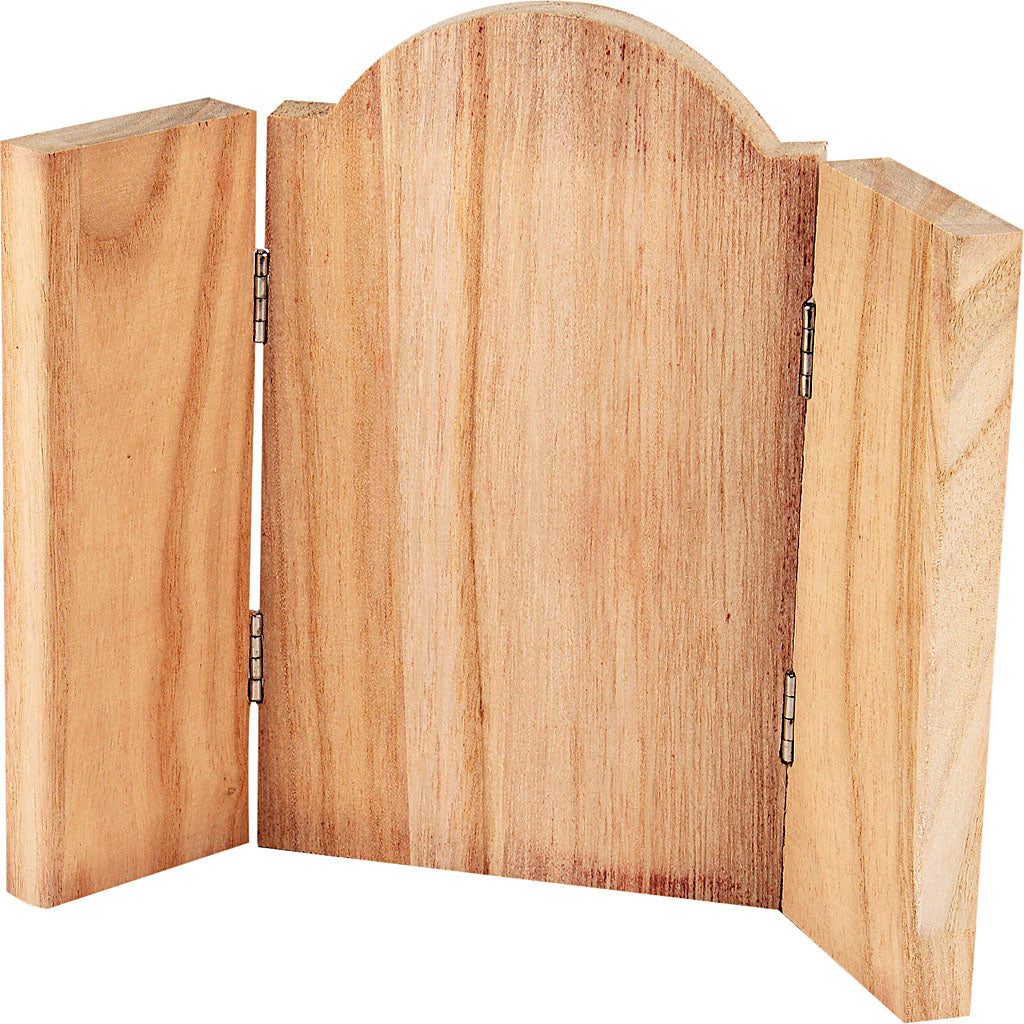 Drieluik ikoon van hout met metalen ophangogen Drieluik ikoon van hout met metalen ophangogen.