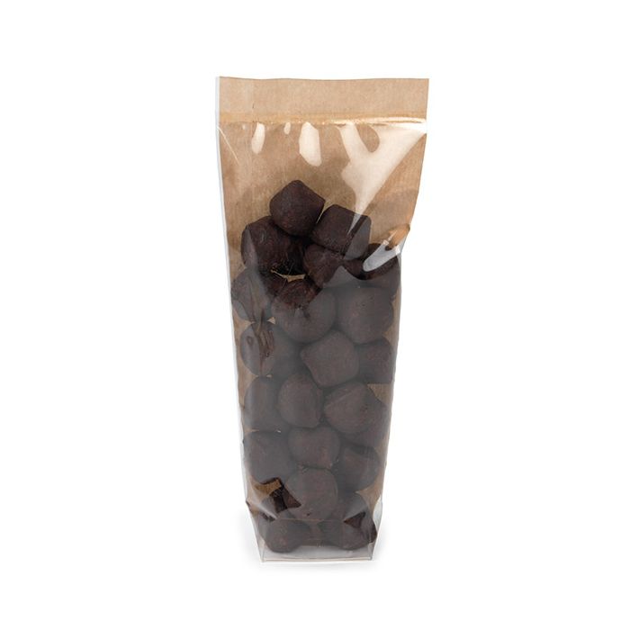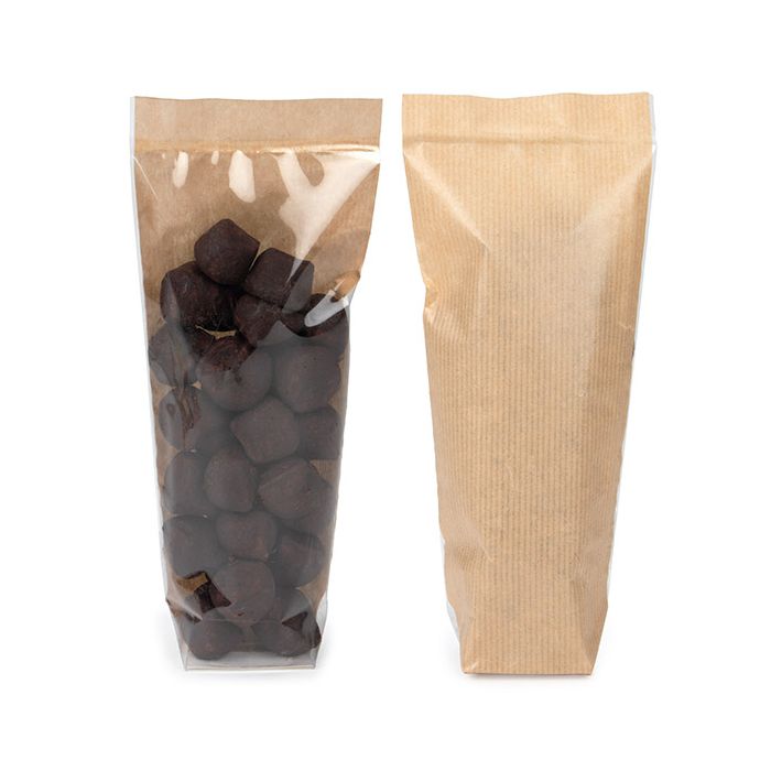 Zijvouw zakken met platte bodem en kraft achterkant zijn een unieke en luxe verpakking voor lichtgewicht artikelen zoals snoep, noten, zaden, snoepwormen, en nog veel meer. FGKB20 heeft een afmeting van 5,1 x 4,4 x 21,6 cm, heeft een doorzichtige voorkant om de artikelen te laten zien en een achterkant van kraftpapier. De bodem is voorzien van een wit papieren inzetstuk dat aan de onderkant van de zak is toegevoegd voor extra steun. Deze zak is gemaakt van voedselveilig materiaal van 85 micron en kan worden geseald. Geschikt voor 226grams producten.