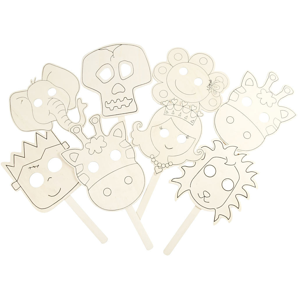 Maskers van hout met ooggaten, een handvat en lijnen. Pak met 8 verschillende designs, van elk 2 stuks. Makkelijk te decoreren met Plus Color markers of acrylverf, etc.