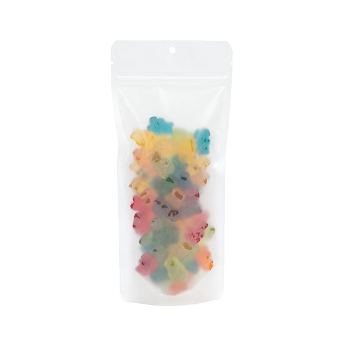 The frosted matte finish of this stand up zipper pouch provides a semi-transparent view of your products. It measures 11 x 6 x 24 cm and is perfect for packaging items like candy, chocolates, coffee beans, and more. The pouch is constructed from food safe materials and is 140 micron thick. ZBGF1N features a round hang hole for the retail environment, resealable zipper to keep products fresh, and afscheur inkepeningen for easy opening after purchase. This tall, narrow pouch can be sat upright on a shelf or hung on a peg. Product can be heat sealed closed for a tamper resistant closure. Custom Printing is available.