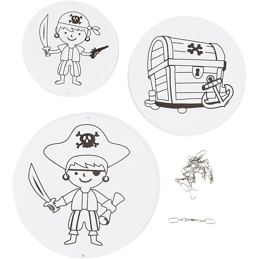 Inhoud: met 3 designs in 3 maten, voor totaal 9 schijven van karton met print aan beide kanten en 9 metalen swivels . Hierdoor kunnen de schijven vrijelijk draaien