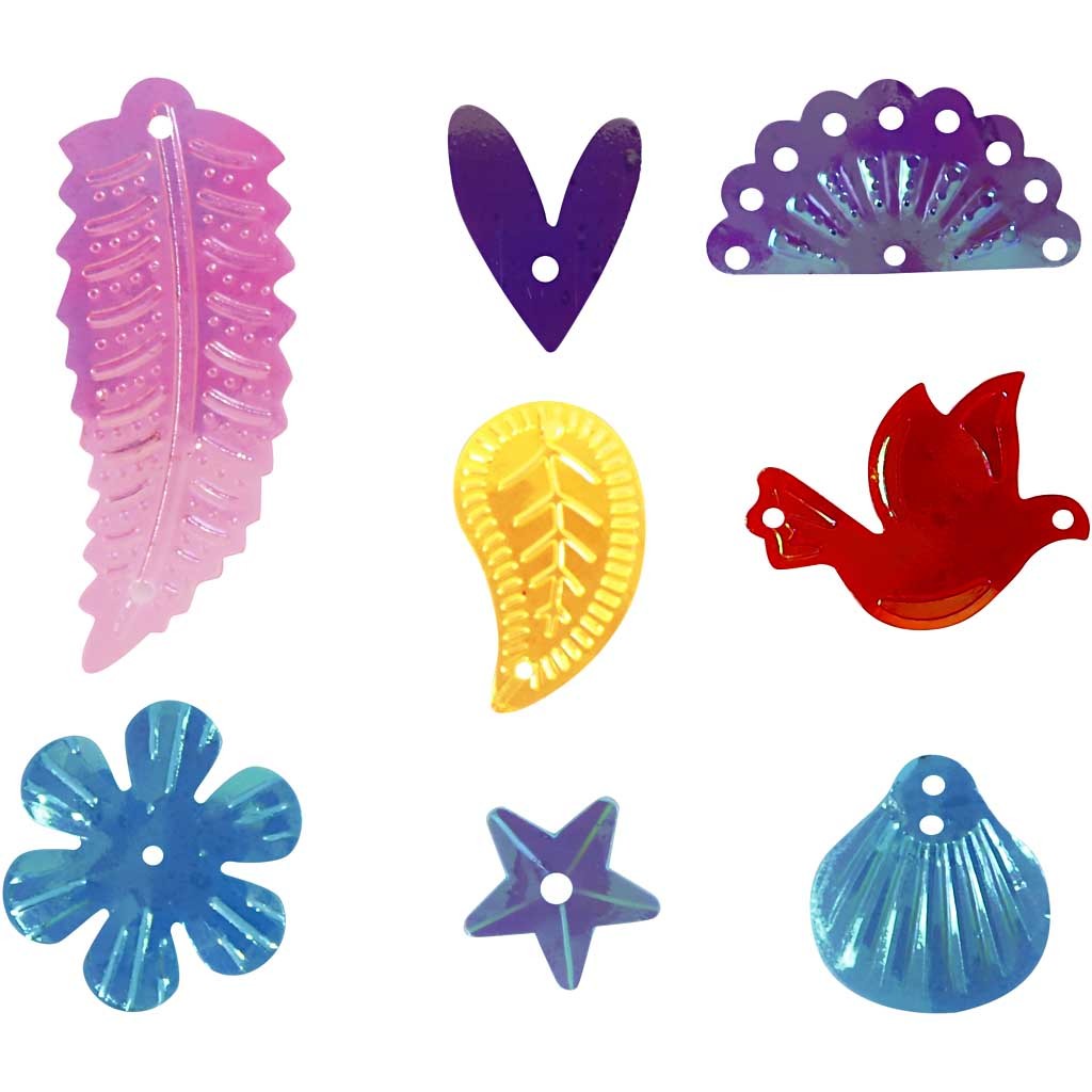 Decoratieve pailletten in diverse vormen en kleuren Mix van kleine pailletten in diverse vormen en heldere kleuren.
