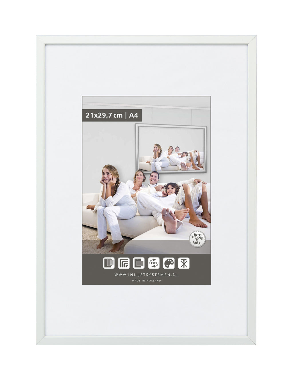 Wissellijst met kristalhelder poly venster (dus vrijwel onbreekbaar). Luxueuze uitstraling en hangt prachtig in elke kamer. De wissellijsten zijn verkrijgbaar in meerdere formaten en kleuren.