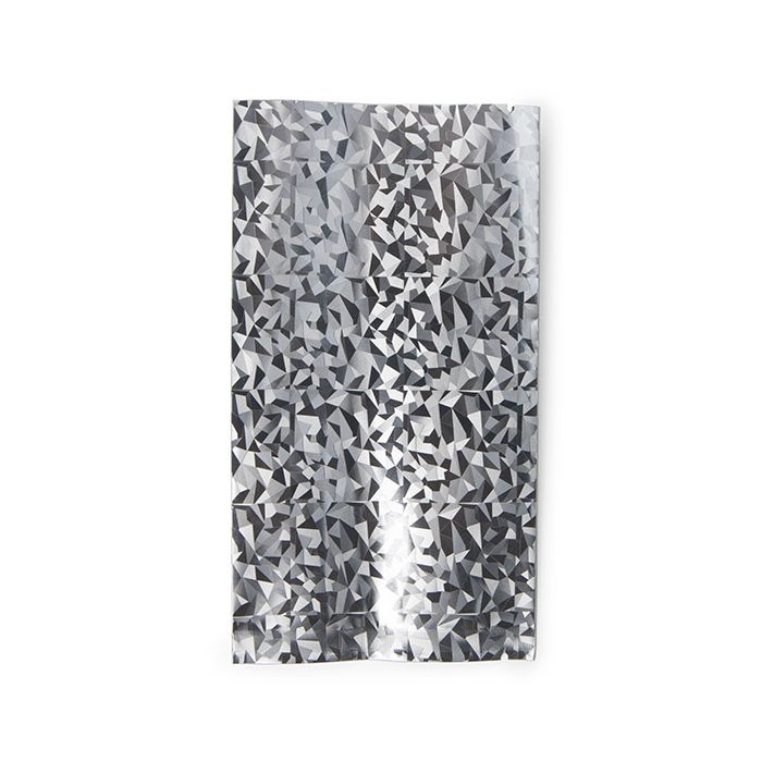 Vlakke Heat Seal Zakjes zijn een geweldige verpakkingsoplossing voor allerlei artikelen. Deze Holografische zakken zijn niet anders, maar wel superleuk en uniek. SVP35HHI meet 7,6 x 14 cm en is gemaakt van voedselveilig VMPET-materiaal van 65 micron voor een hoge barrièrebescherming. Deze zakjes zijn geweldig voor het verpakken van bijvoorbeeld koffiedik, trail mix, chocolade, badzout, wax melts en ruilkaarten. De ondoorzichtige zilveren zakjes hebben een geometrisch "ijs"-patroon en zijn ideaal voor feestgunsten, cadeaus, verrassingspakketten en nog veel meer. De zakjes hebben een open einde zodat ze gemakkelijk kunnen worden gevuld en kunnen met hitte worden gesloten. Een bodem- en rugnaad zorgen voor extra stevigheid. Scheurinkepingen bevinden zich aan beide uiteinden voor eenvoudig openen door de eindgebruiker.