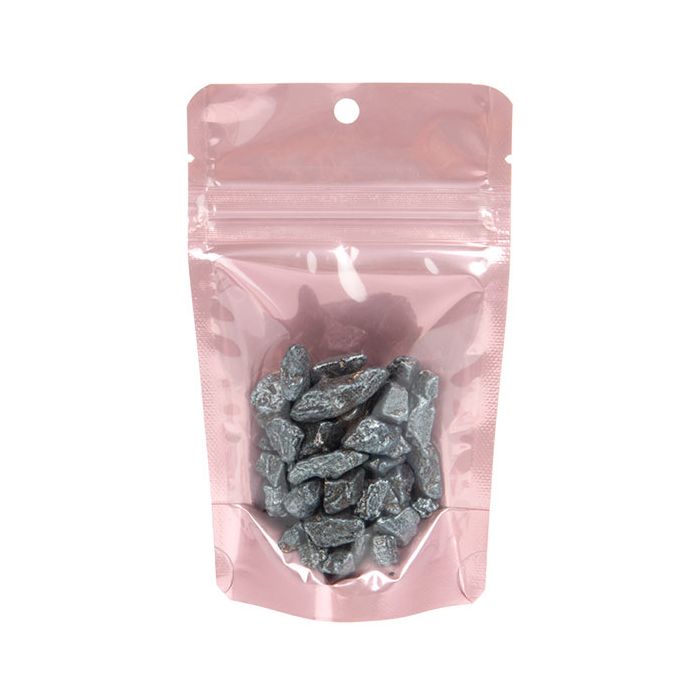 ZBGRG1 measures 8 x 5 x 13 cm and is ideal for packaging small items like custom sprinkle mixes, craft supplies, gummy candy, bath salts, tiny toys, embellishments, and more. The front panel of this pouch is crystal clear allowing the contents to be seen, while the inside and back panels are a pretty rose gold color. The back panel is opaque and provides room for branding With a label, nutrition facts, or bar code. Stand Up Zipper Pouches feature a resealable, airtight zipper that helps keep contents fresh. afscheur inkepeningen are located above the zipper, so the bag can be easily opened once heat sealed. A 1/4” round hang hole comes pre-punched so it can be hung on a standard peg display. This rose gold pouch is made from 100 micron food safe materials.