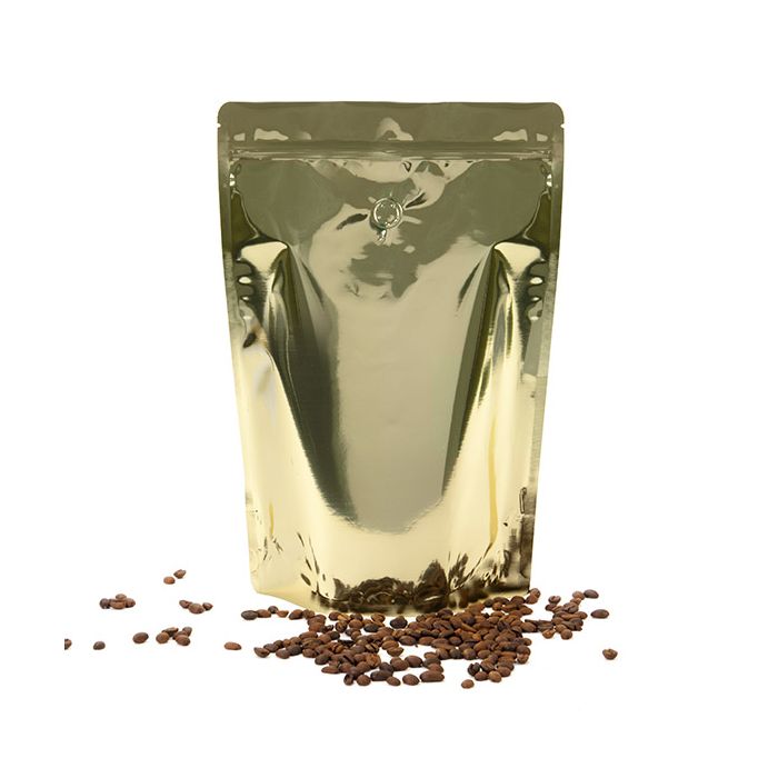 ZBGM6SGB is our classic Stand Up Zipper Pouch that has been redesigned to hold coffee and tea. This 125 micron pouch has outer measurements of 22,9 x 12,1 x 34,3 cm and usable space of 21,9 x 10,2 x 30,3 cm It is ideal for holding 2 pounds of whole coffee beans, coffee grounds, and tea leaves. It features a one-way degassing valve that vents the CO2. Stand Up Pouches are great for standing on a retail shelf or counter. This bag is made from high barrier materials and features a resealable zipper to lock in freshness. The solid shimmer gold exterior of this bag allows plenty of room for branding using labels or stickers. afscheur inkepeningen are located above the zipper for ease of opening if heat sealed closed.