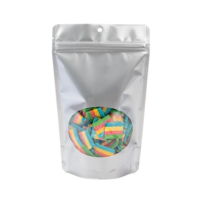 Like the sneak preview of much anticipated movie, our Silver Oval Window Zipper Pouch Bags give customers a peek of your product before they buy. ZBGO3SH is our 13 x 7,9 x 20,6 cm pouch With window dimensions of 10 x 6,7 cm These polished 4.8 mil pouches hold 113g of products like coffee, rice, bath salts, and powdered mixes. Laminated materials provide a high barrier to lock in flavors and aromas, while a resealable zipper keeps contents fresh after opening. Bags can be heat sealed to close. These self-supporting pouches are easy to brand With an added sticker, label, or custom design.