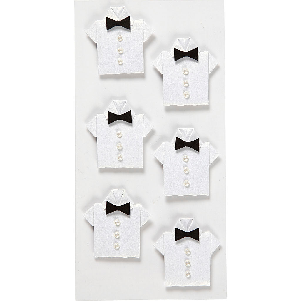 Stickers in de vorm van een overhemd met zelfklevende pad aan de achterkant voor een 3D effect. Het overhemd is in origami gevouwen met extra fijne details van wit papier en parelmoer, een zwart vlinderdasje en knopen van kleine strasstenen.