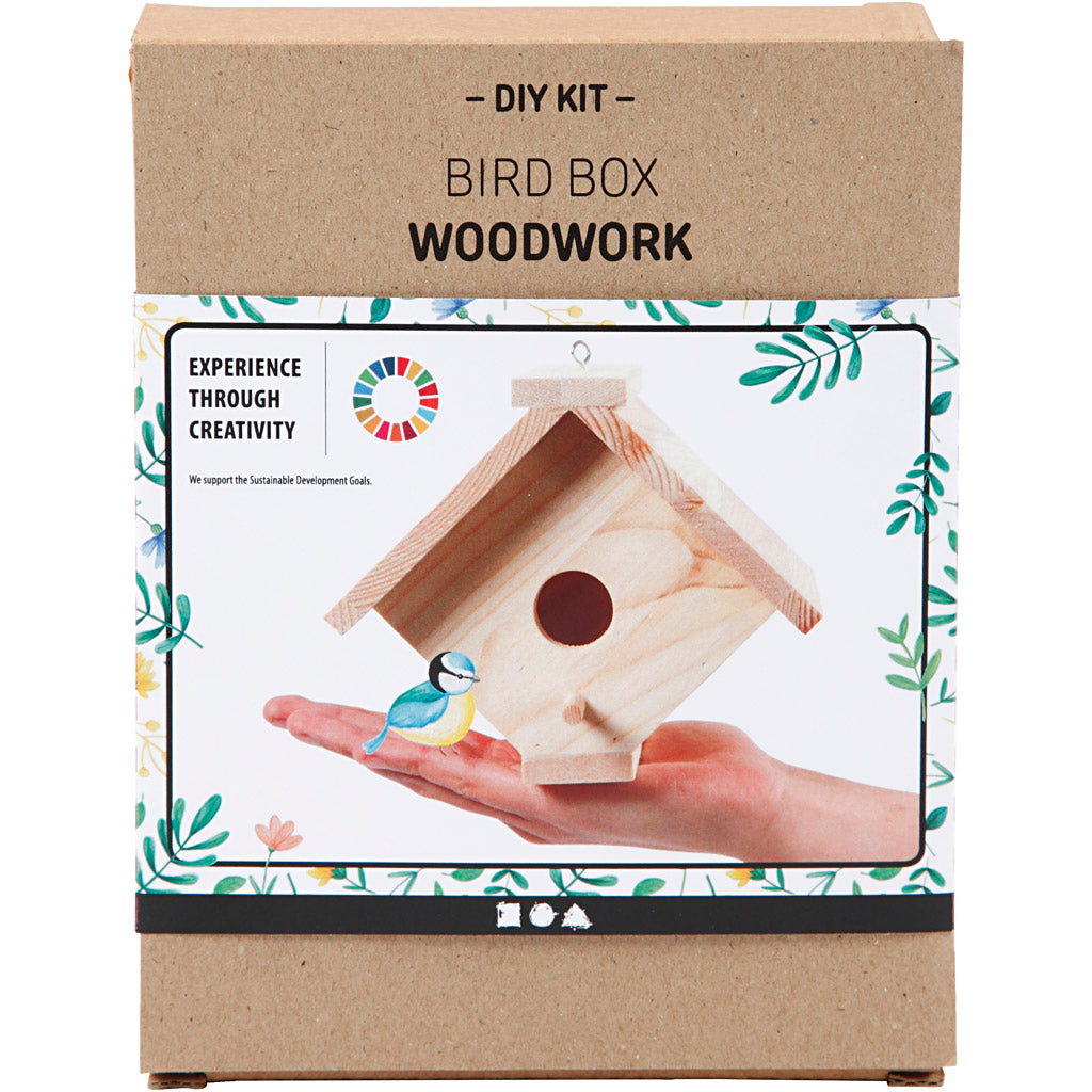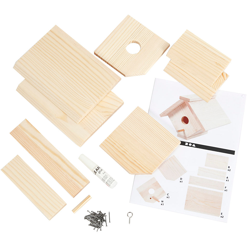 Materialenset om zelf een vogelhuis van licht hout te maken met een gat van 25 mm. Inclusief instructie